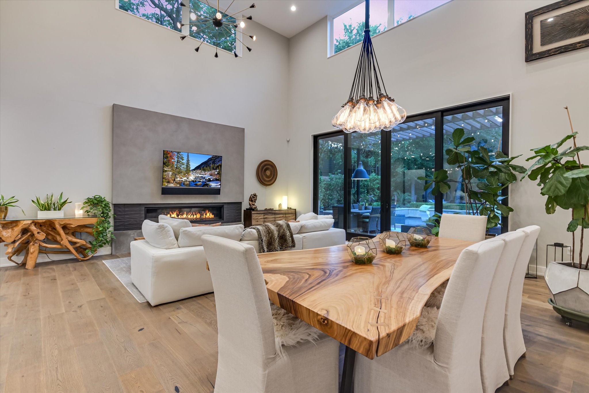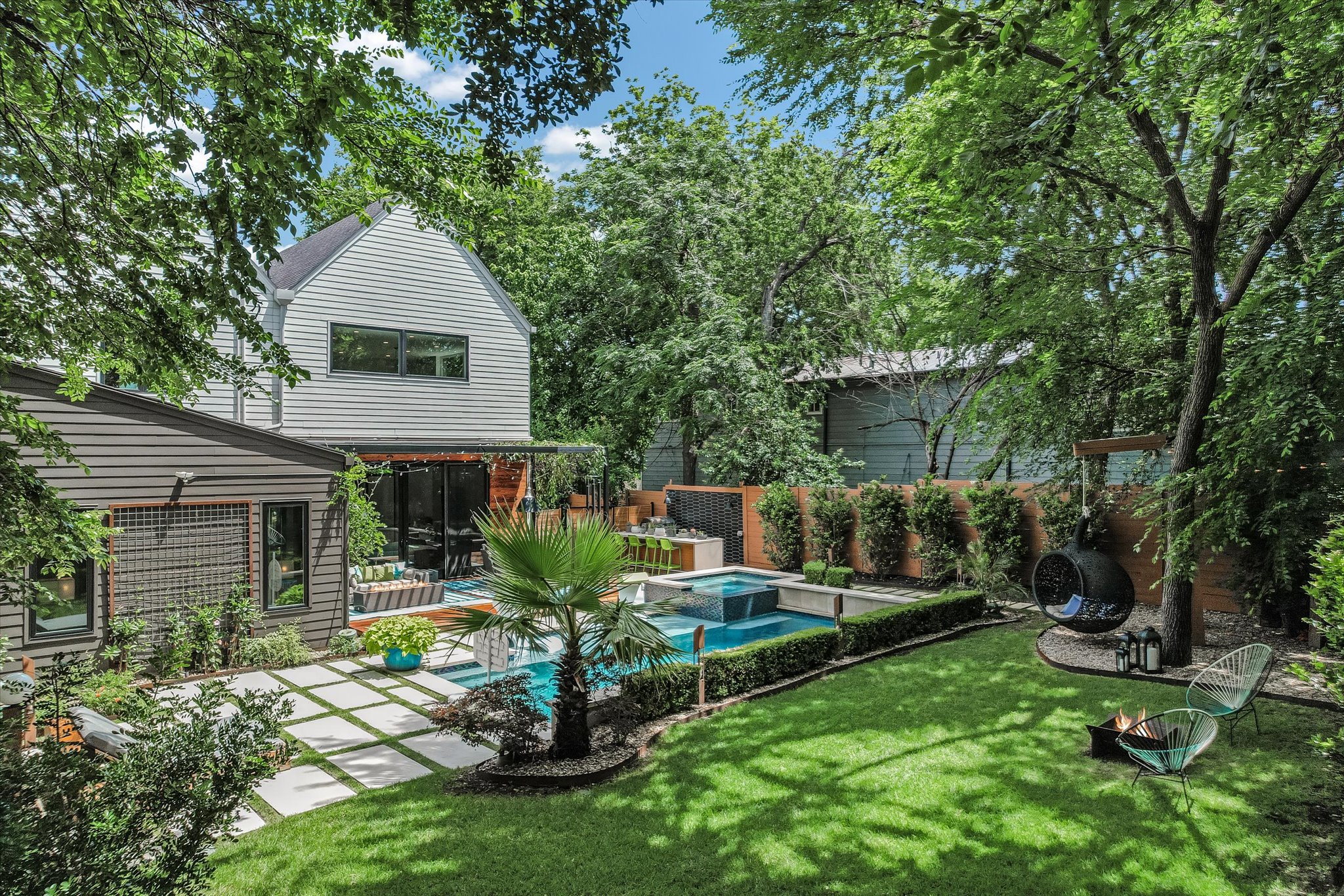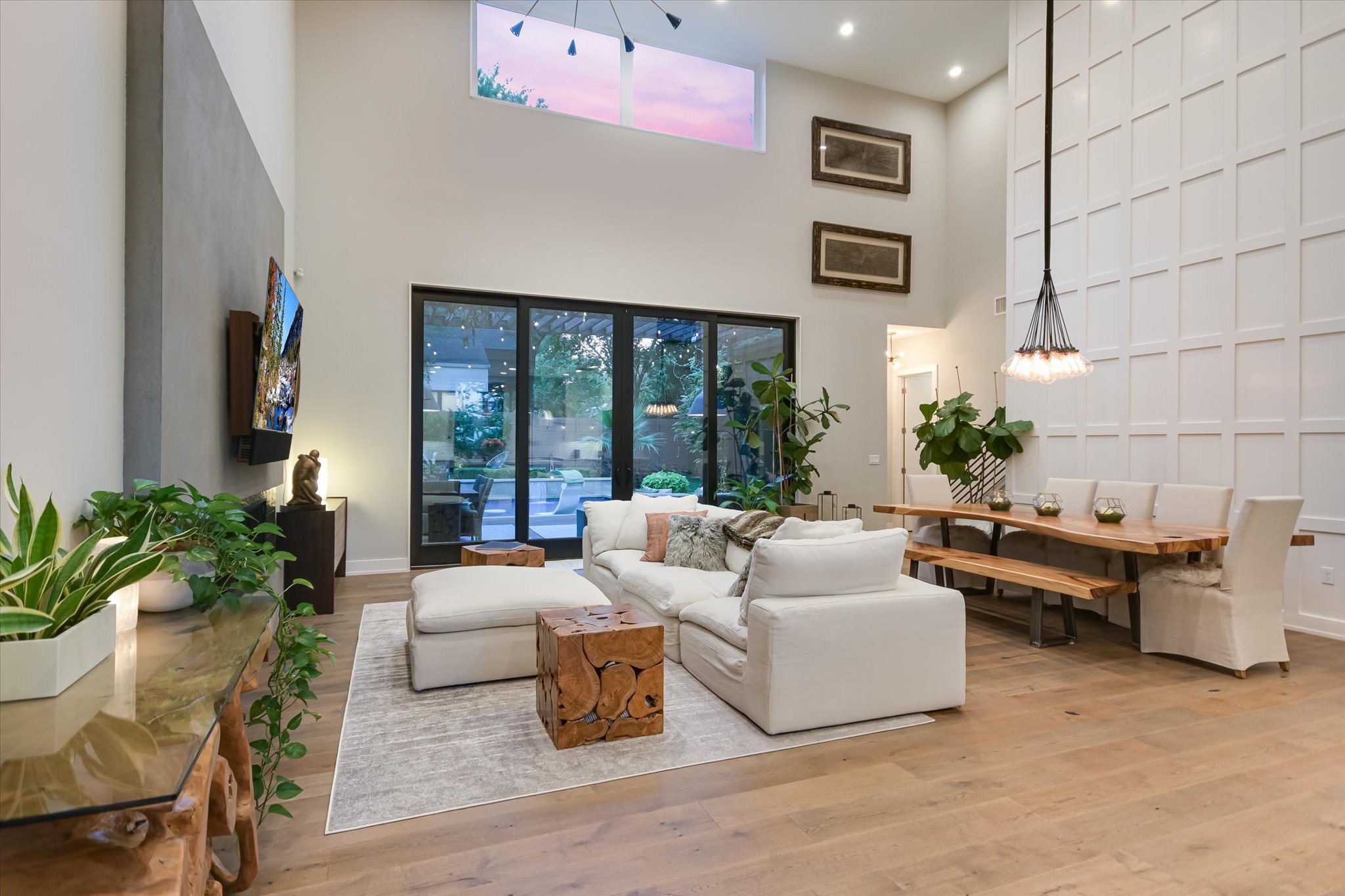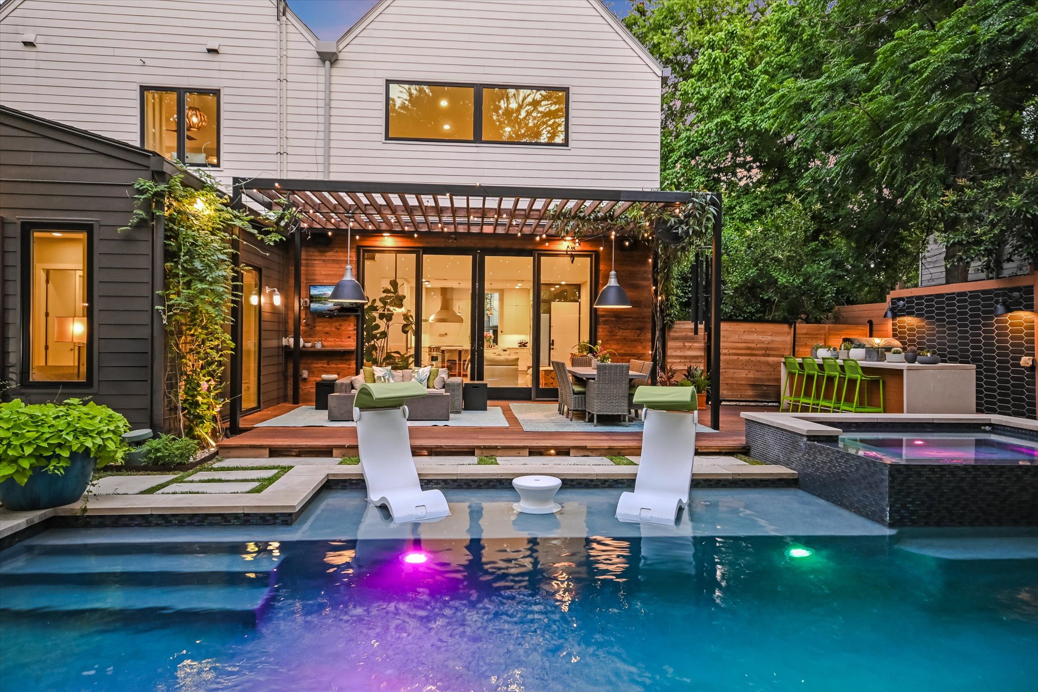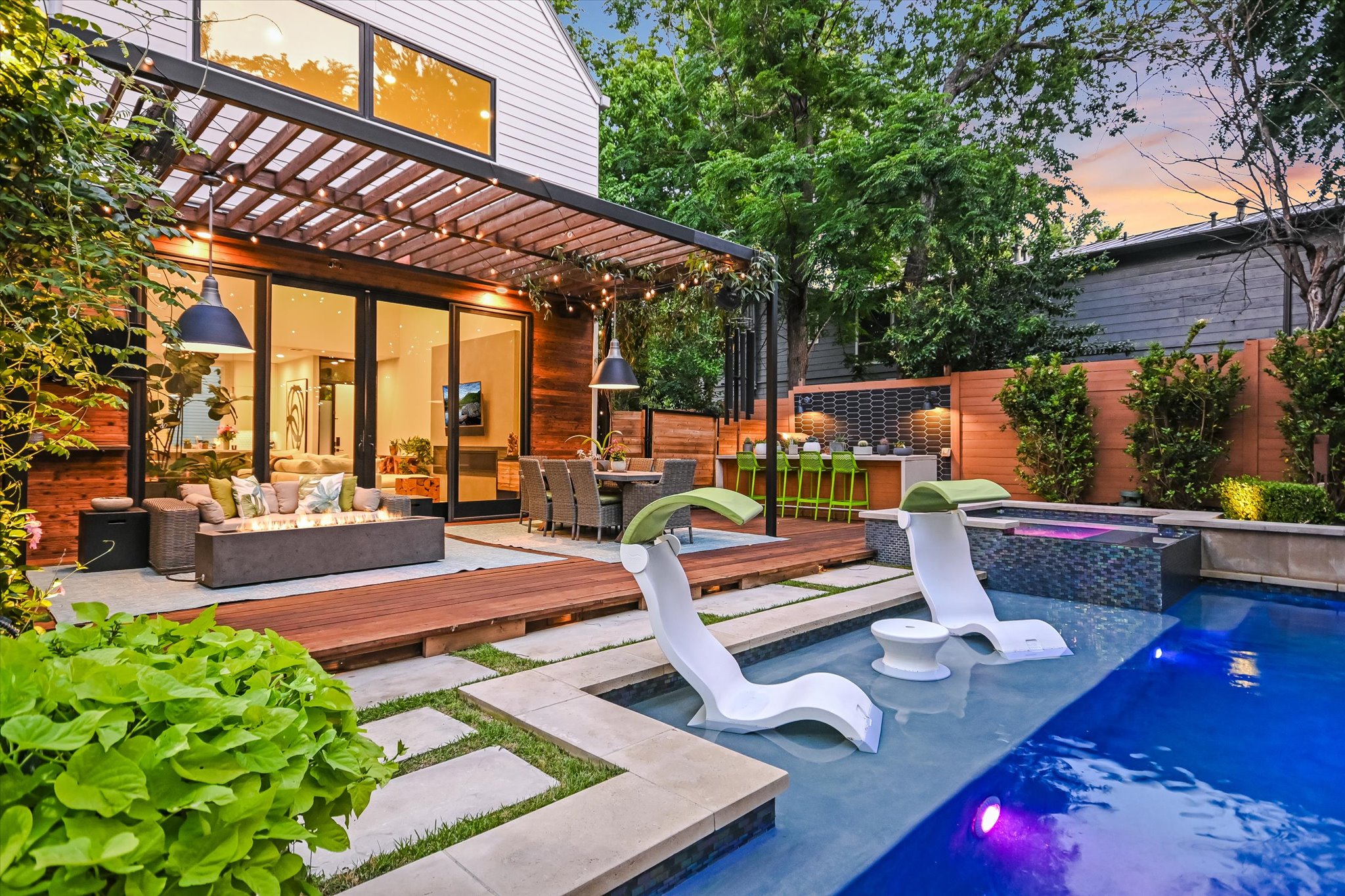From the lovely, raised garden and vine covered front walk you will step through the door and be awed at the volume of space that flows from inside to the lush, mature landscape. The living room ceiling soars to 20 feet and is accented with a striking accent wall that adds drama and texture. Opposite, a sleek concrete surround frames a linear gas fireplace. The open space is grounded by warm wide-plank oak floors. Oversized steel windows slide open to the pergola-covered deck, extending the living space even further. Exceptionally large for a townhome, the oversized back yard is a private outdoor resort, with limestone-coped pool and spa, outdoor kitchen and bar, firepit, lounge areas, mature trees and more. Fenced and gorgeously landscaped, you will find yourself constantly drawn outside to listen to the birds and feel the breeze ruffling the trees.
