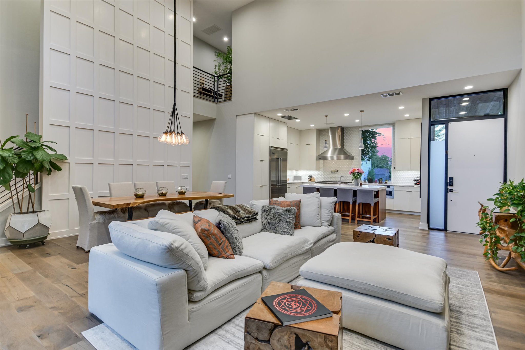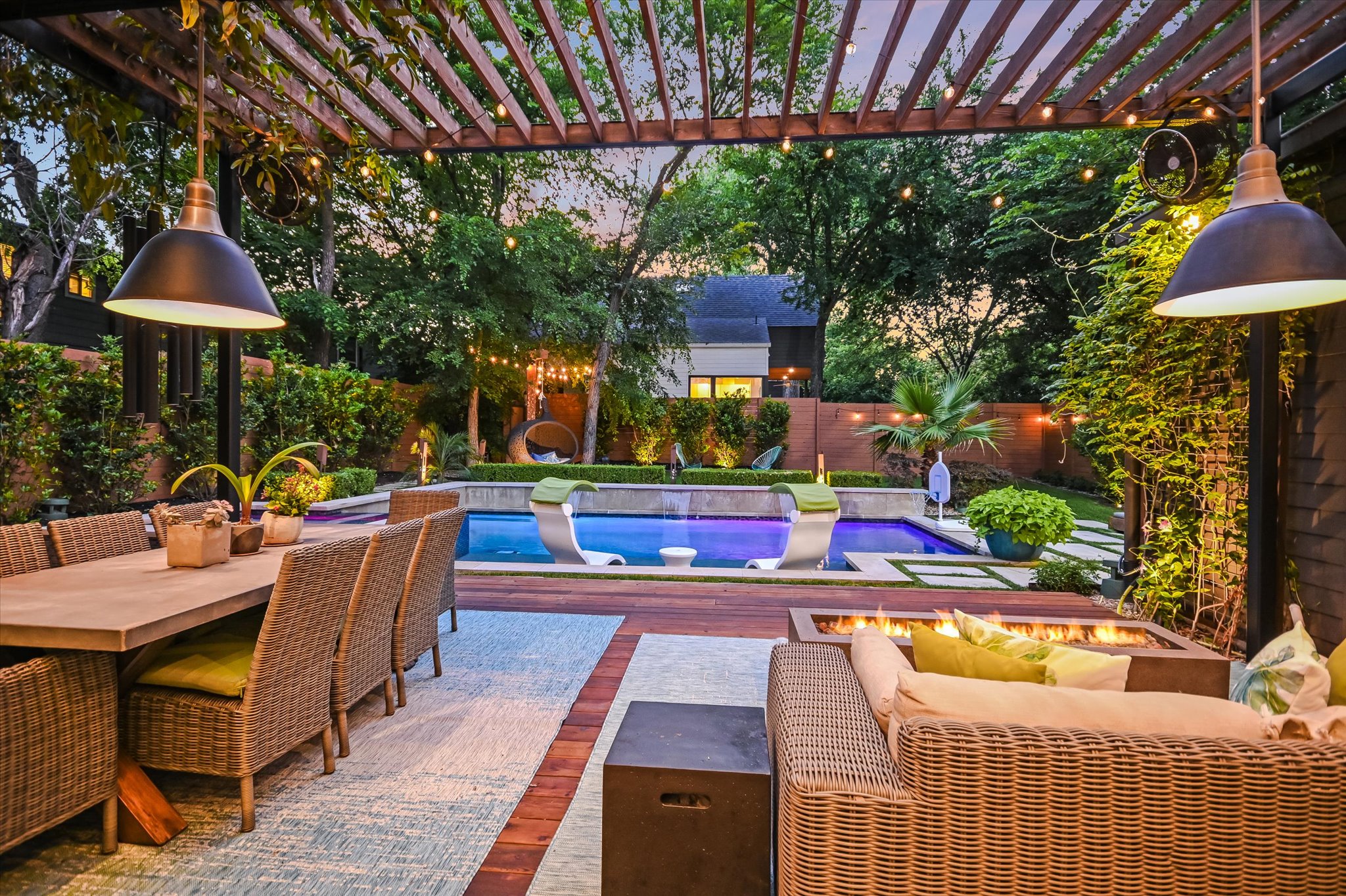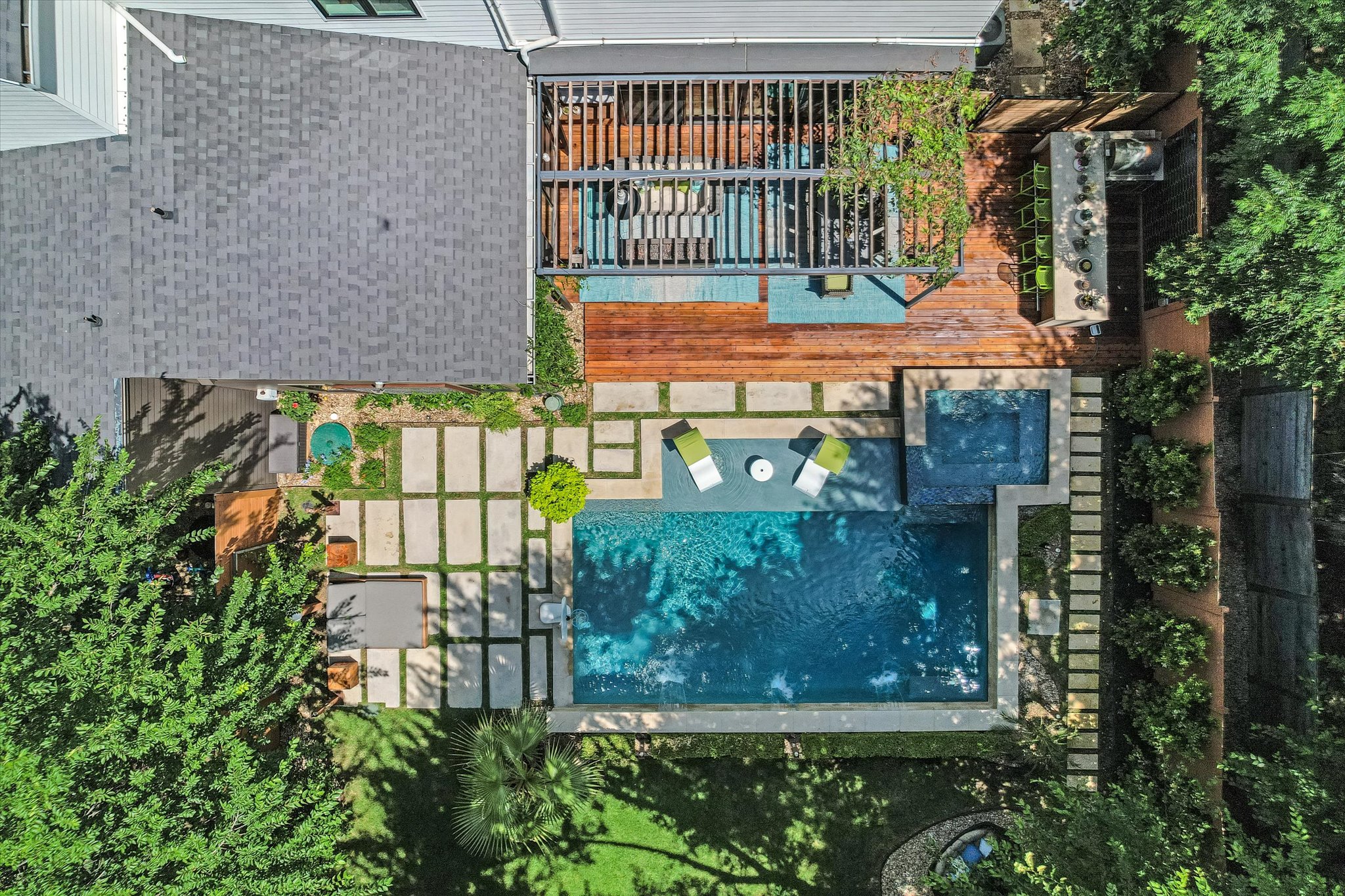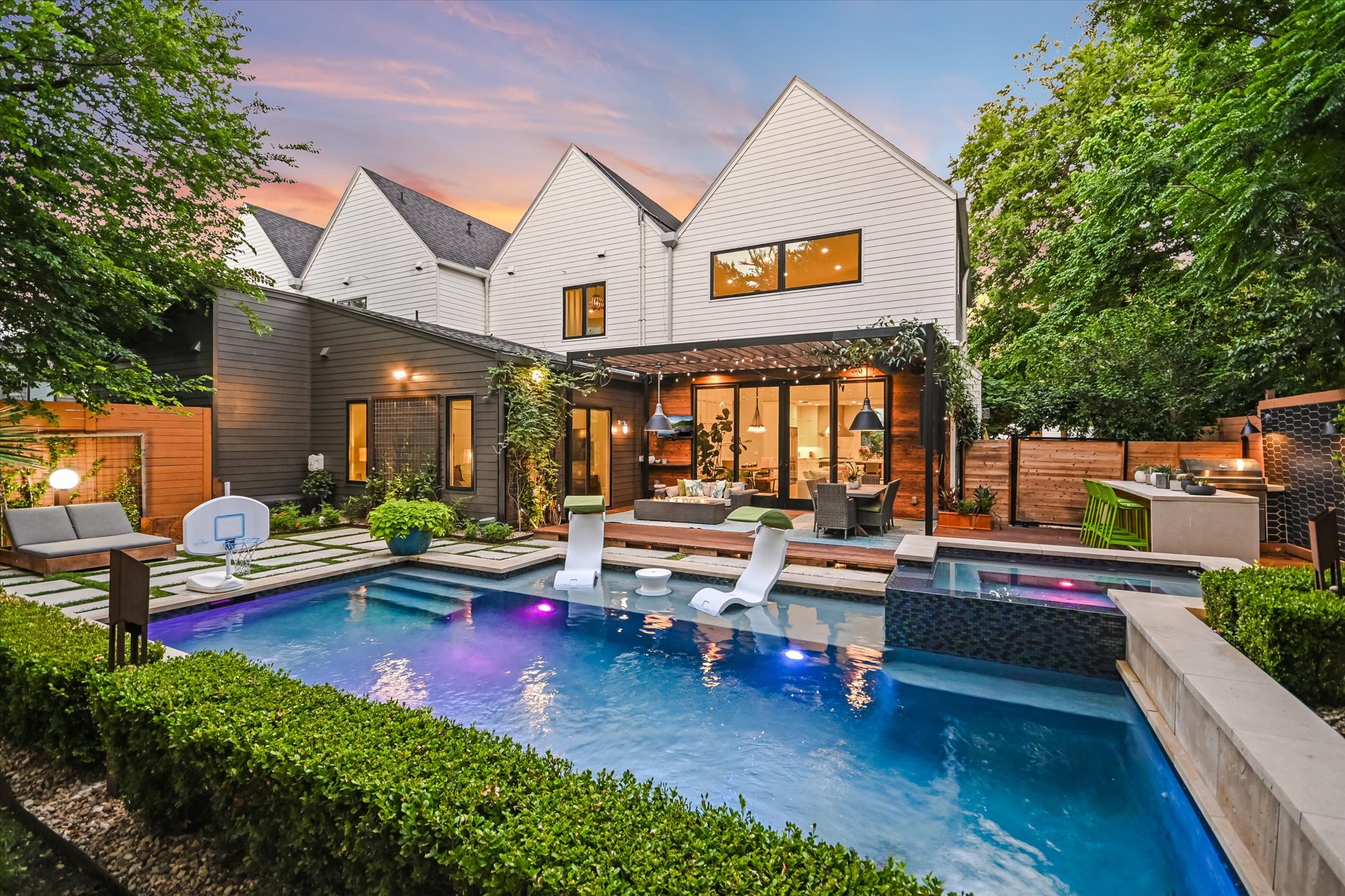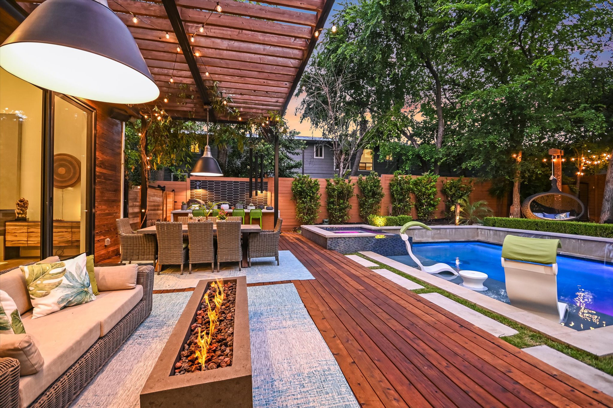 From the lovely, raised garden and vine covered front walk you will step through the door and be awed at the volume of space that flows from inside to the lush, mature landscape. The living room ceiling soars to 20 feet and is accented with a striking accent wall that adds drama and texture. Opposite, a sleek concrete surround frames a linear gas fireplace. The open space is grounded by warm wide-plank oak floors. Oversized steel windows slide open to the pergola-covered deck, extending the living space even further. Exceptionally large for a townhome, the oversized back yard is a private outdoor resort, with limestone-coped pool and spa, outdoor kitchen and bar, firepit, lounge areas, mature trees and more. Fenced and gorgeously landscaped, you will find yourself constantly drawn outside to listen to the birds and feel the breeze ruffling the trees.