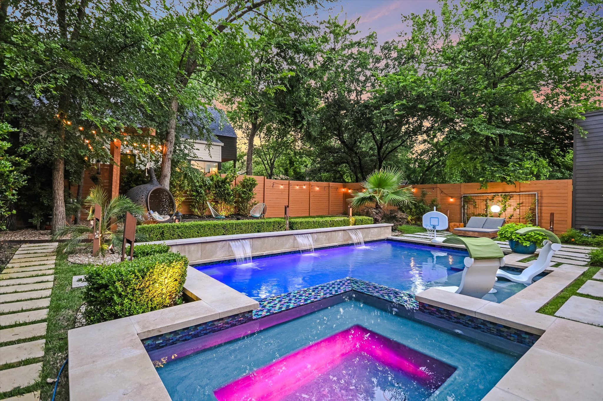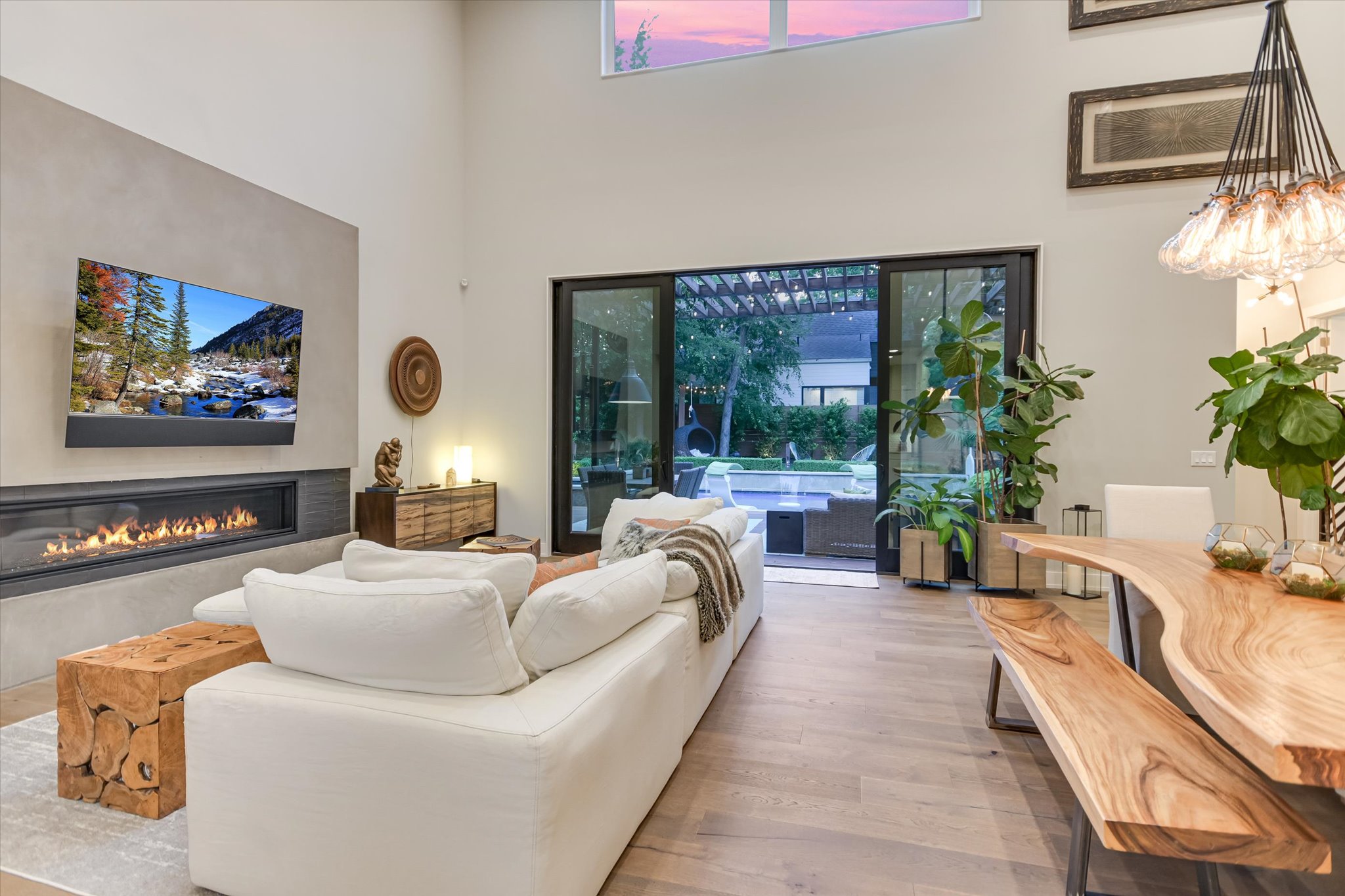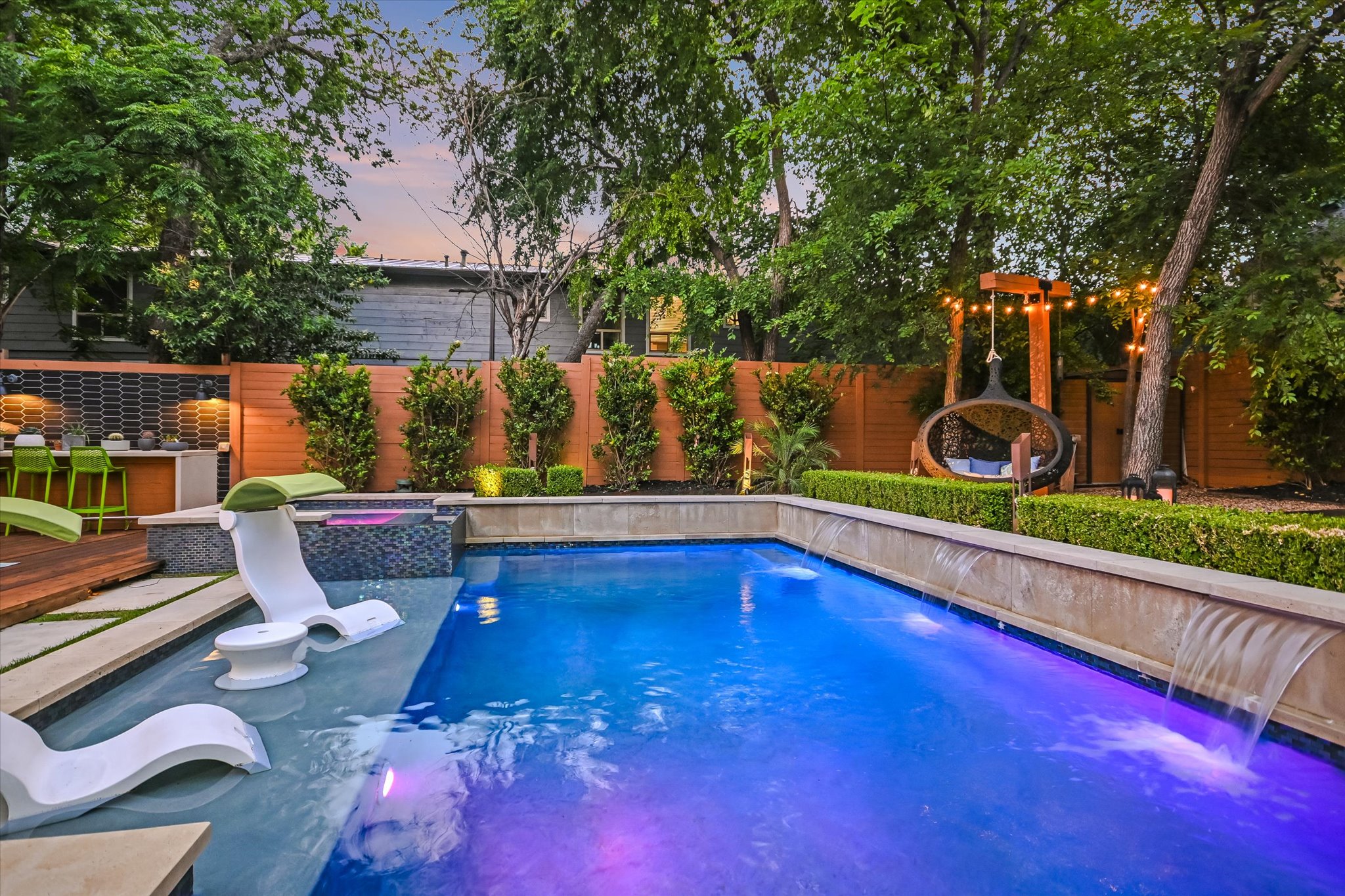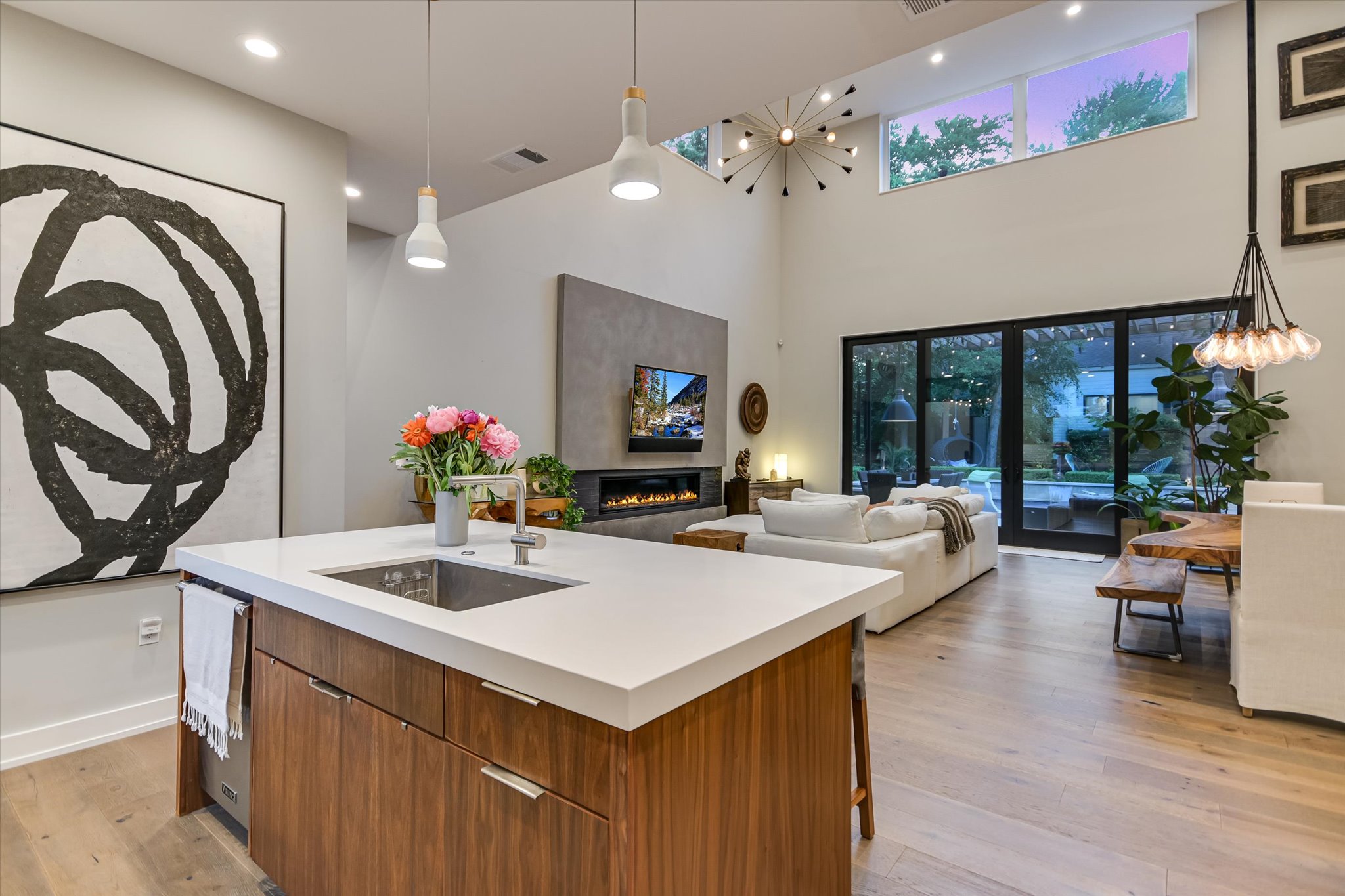 From the lovely, raised garden and vine covered front walk you will step through the door and be awed at the volume of space that flows from inside to the lush, mature landscape. The living room ceiling soars to 20 feet and is accented with a striking accent wall that adds drama and texture. Opposite, a sleek concrete surround frames a linear gas fireplace. The open space is grounded by warm wide-plank oak floors. Oversized steel windows slide open to the pergola-covered deck, extending the living space even further. Exceptionally large for a townhome, the oversized back yard is a private outdoor resort, with limestone-coped pool and spa, outdoor kitchen and bar, firepit, lounge areas, mature trees and more. Fenced and gorgeously landscaped, you will find yourself constantly drawn outside to listen to the birds and feel the breeze ruffling the trees.