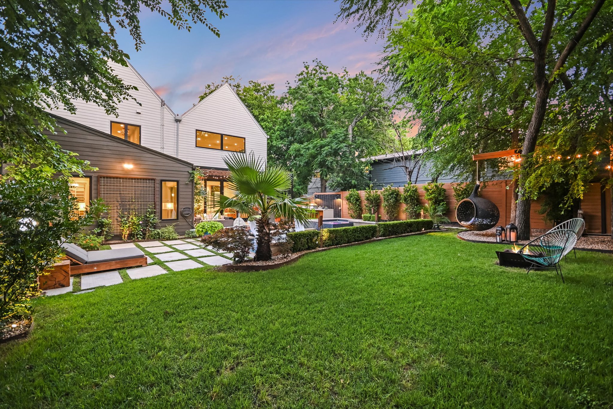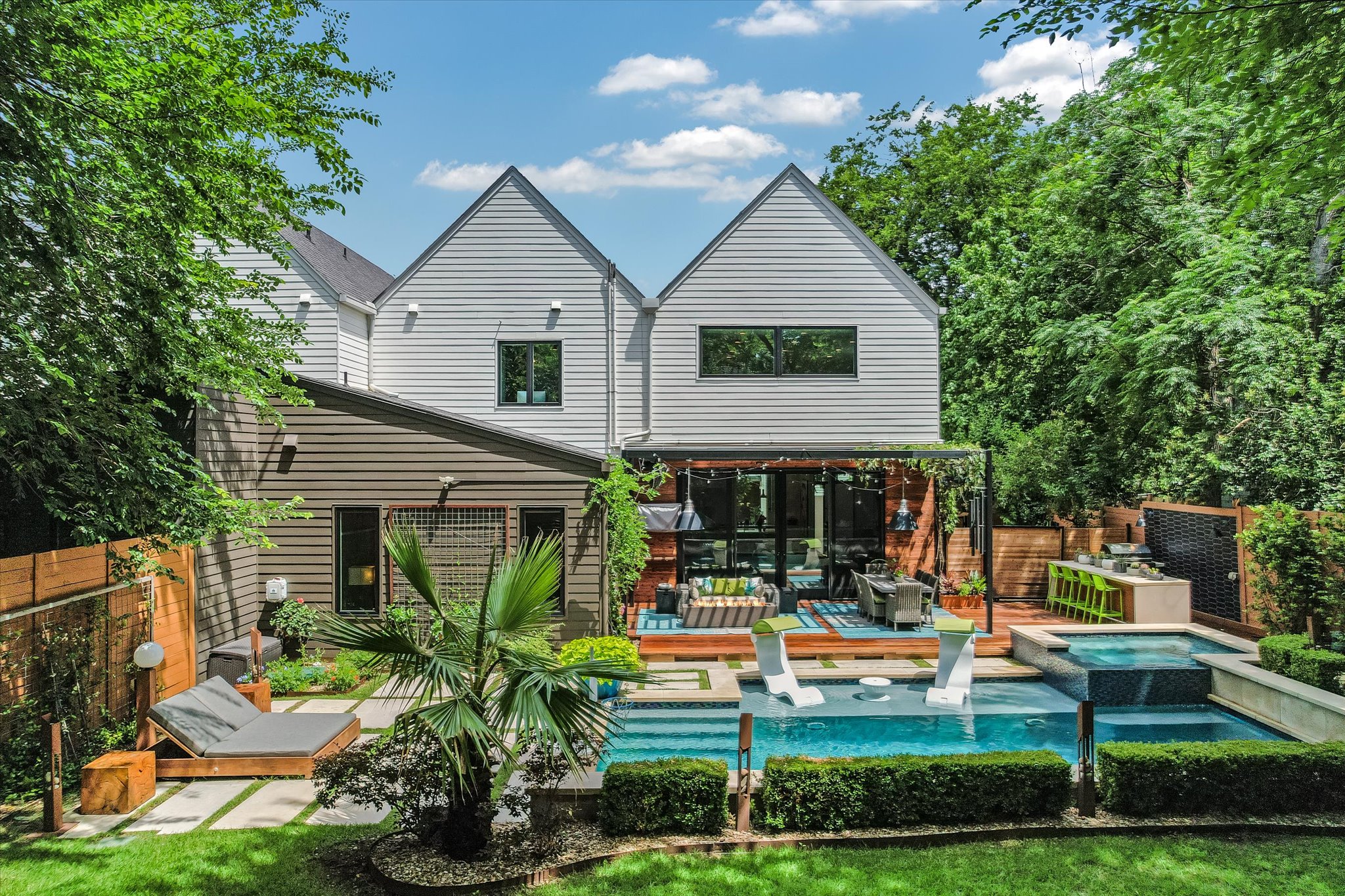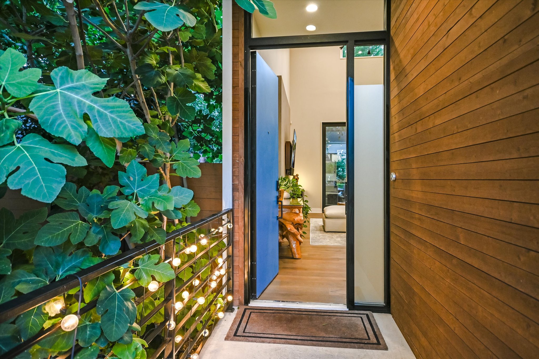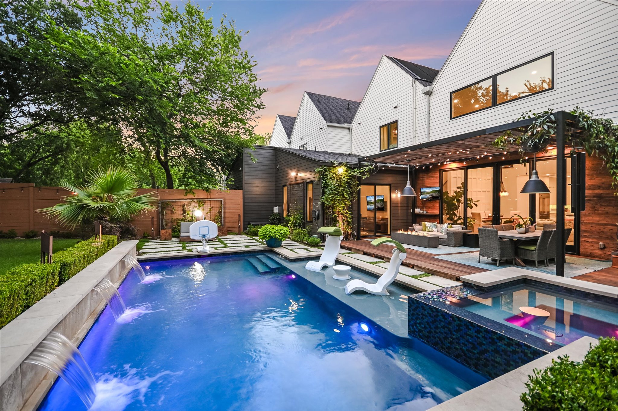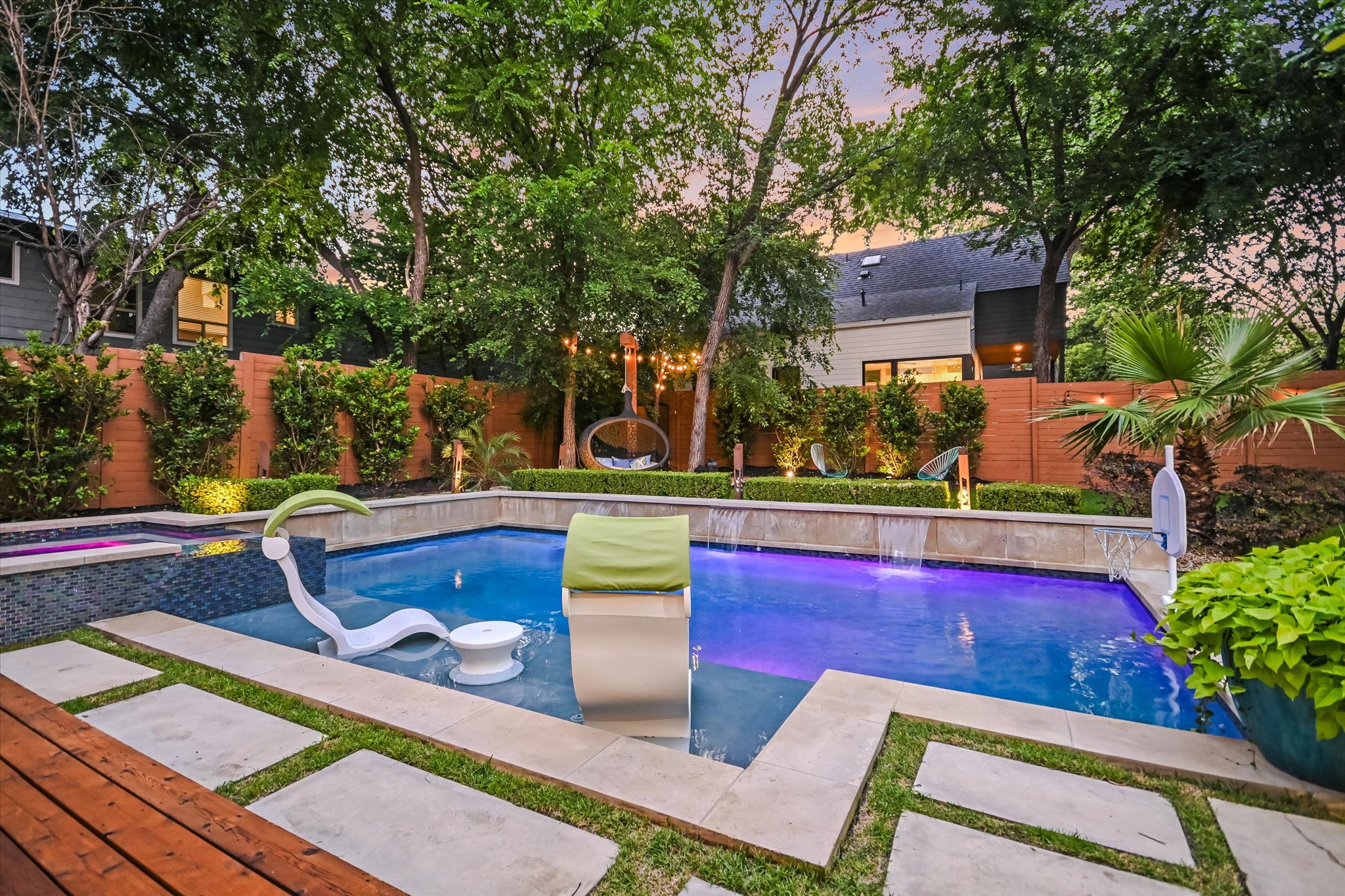 From the lovely, raised garden and vine covered front walk you will step through the door and be awed at the volume of space that flows from inside to the lush, mature landscape. The living room ceiling soars to 20 feet and is accented with a striking accent wall that adds drama and texture. Opposite, a sleek concrete surround frames a linear gas fireplace. The open space is grounded by warm wide-plank oak floors. Oversized steel windows slide open to the pergola-covered deck, extending the living space even further. Exceptionally large for a townhome, the oversized back yard is a private outdoor resort, with limestone-coped pool and spa, outdoor kitchen and bar, firepit, lounge areas, mature trees and more. Fenced and gorgeously landscaped, you will find yourself constantly drawn outside to listen to the birds and feel the breeze ruffling the trees.