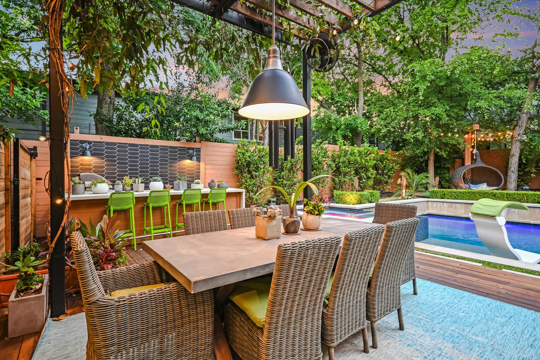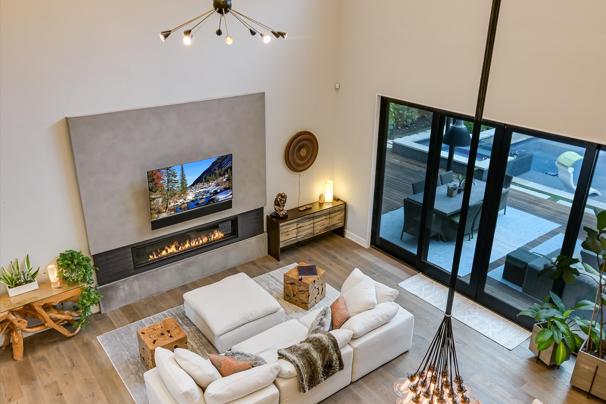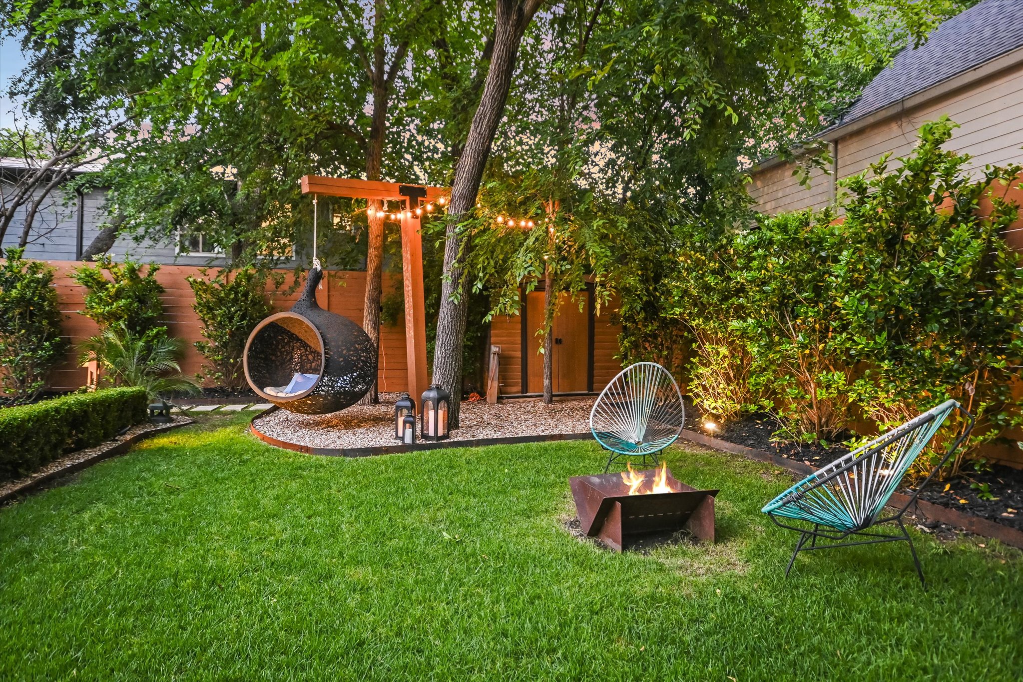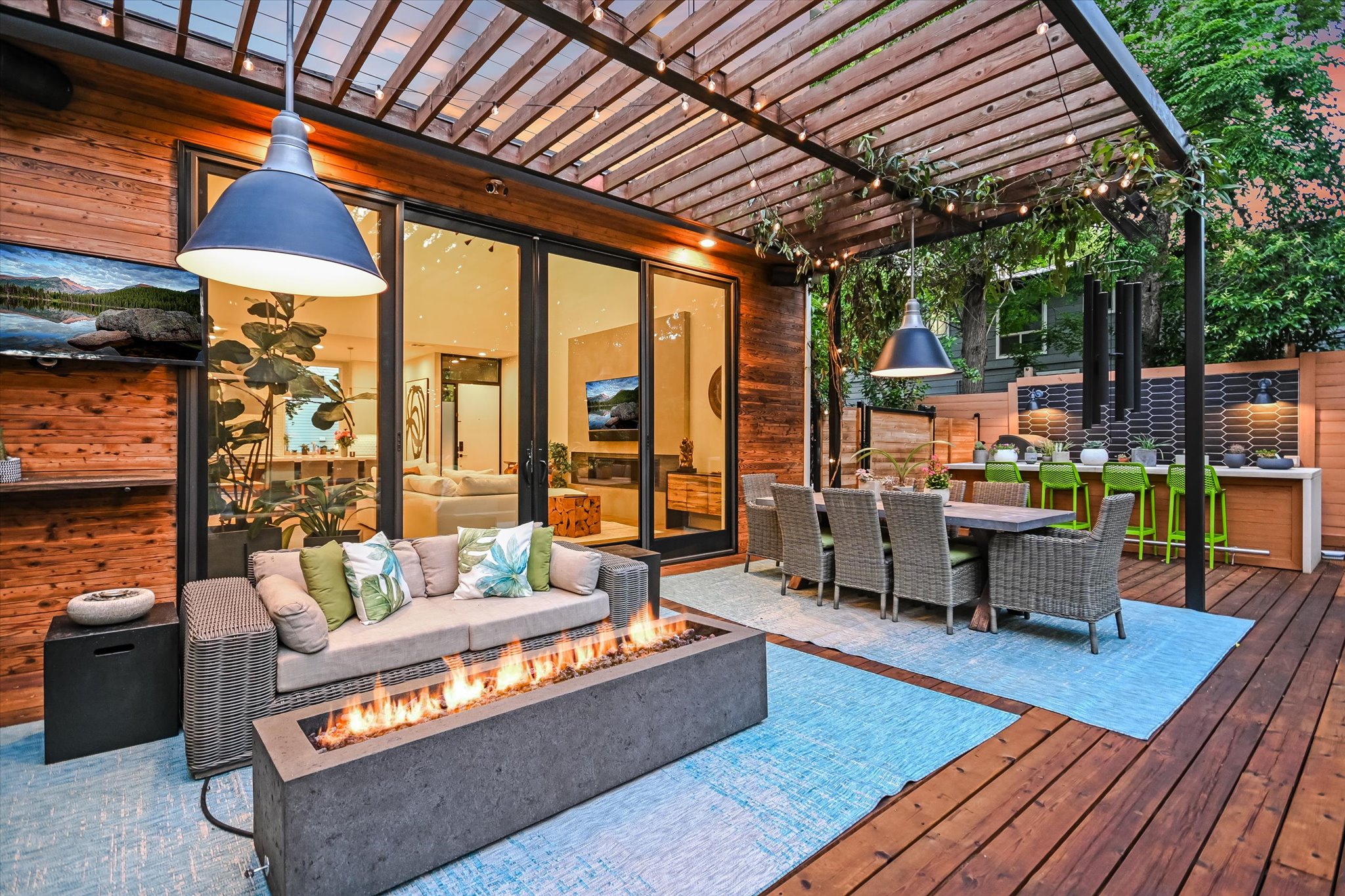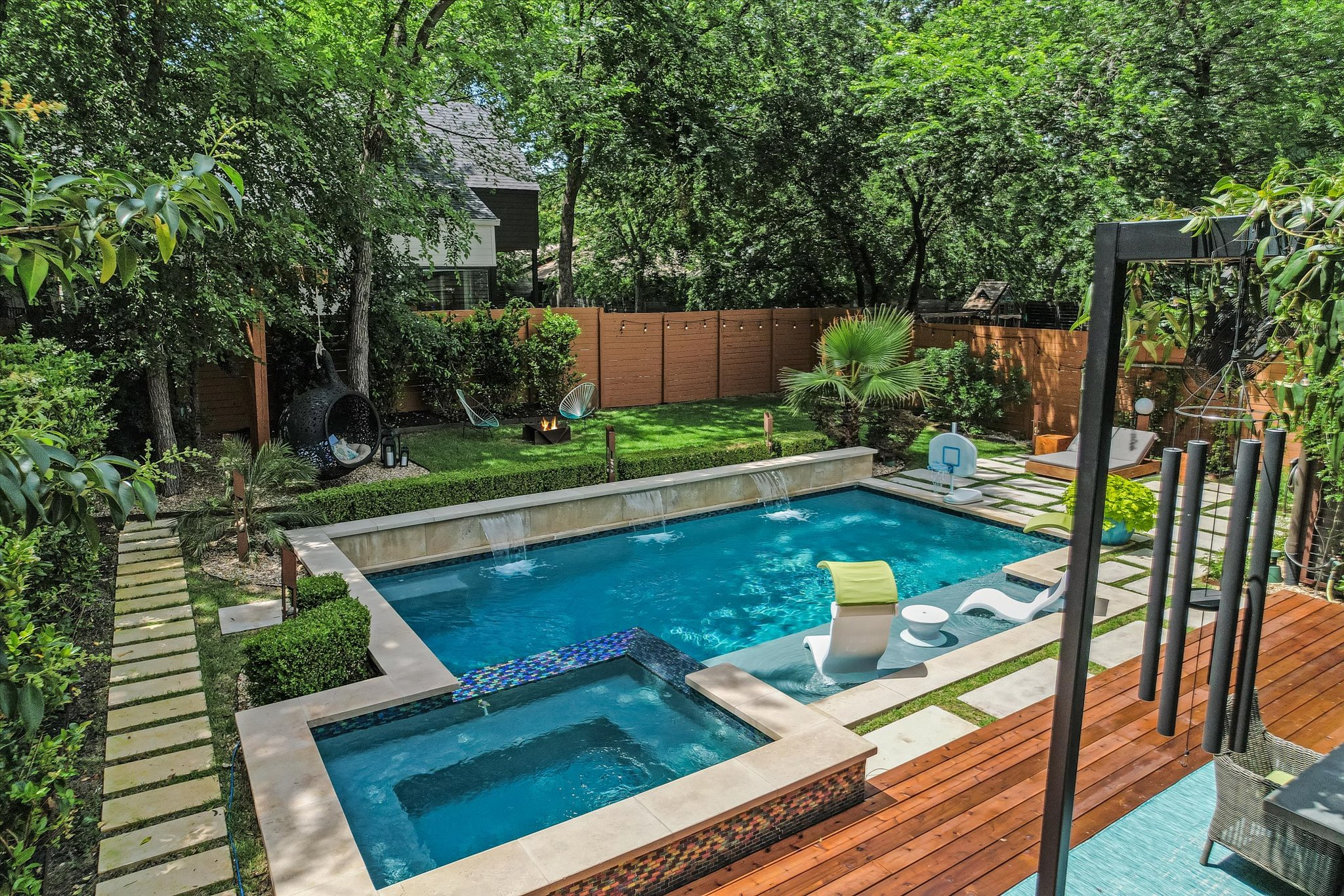 From the lovely, raised garden and vine covered front walk you will step through the door and be awed at the volume of space that flows from inside to the lush, mature landscape. The living room ceiling soars to 20 feet and is accented with a striking accent wall that adds drama and texture. Opposite, a sleek concrete surround frames a linear gas fireplace. The open space is grounded by warm wide-plank oak floors. Oversized steel windows slide open to the pergola-covered deck, extending the living space even further. Exceptionally large for a townhome, the oversized back yard is a private outdoor resort, with limestone-coped pool and spa, outdoor kitchen and bar, firepit, lounge areas, mature trees and more. Fenced and gorgeously landscaped, you will find yourself constantly drawn outside to listen to the birds and feel the breeze ruffling the trees.