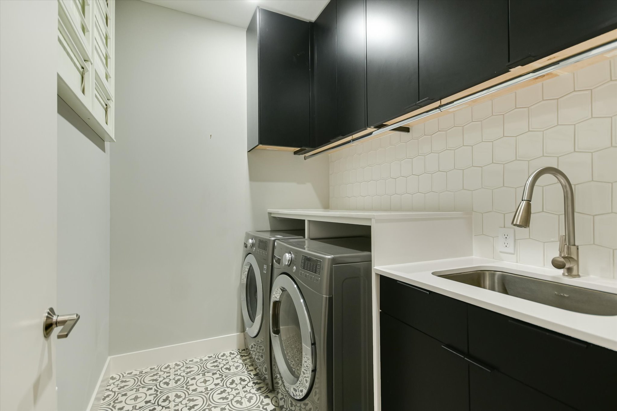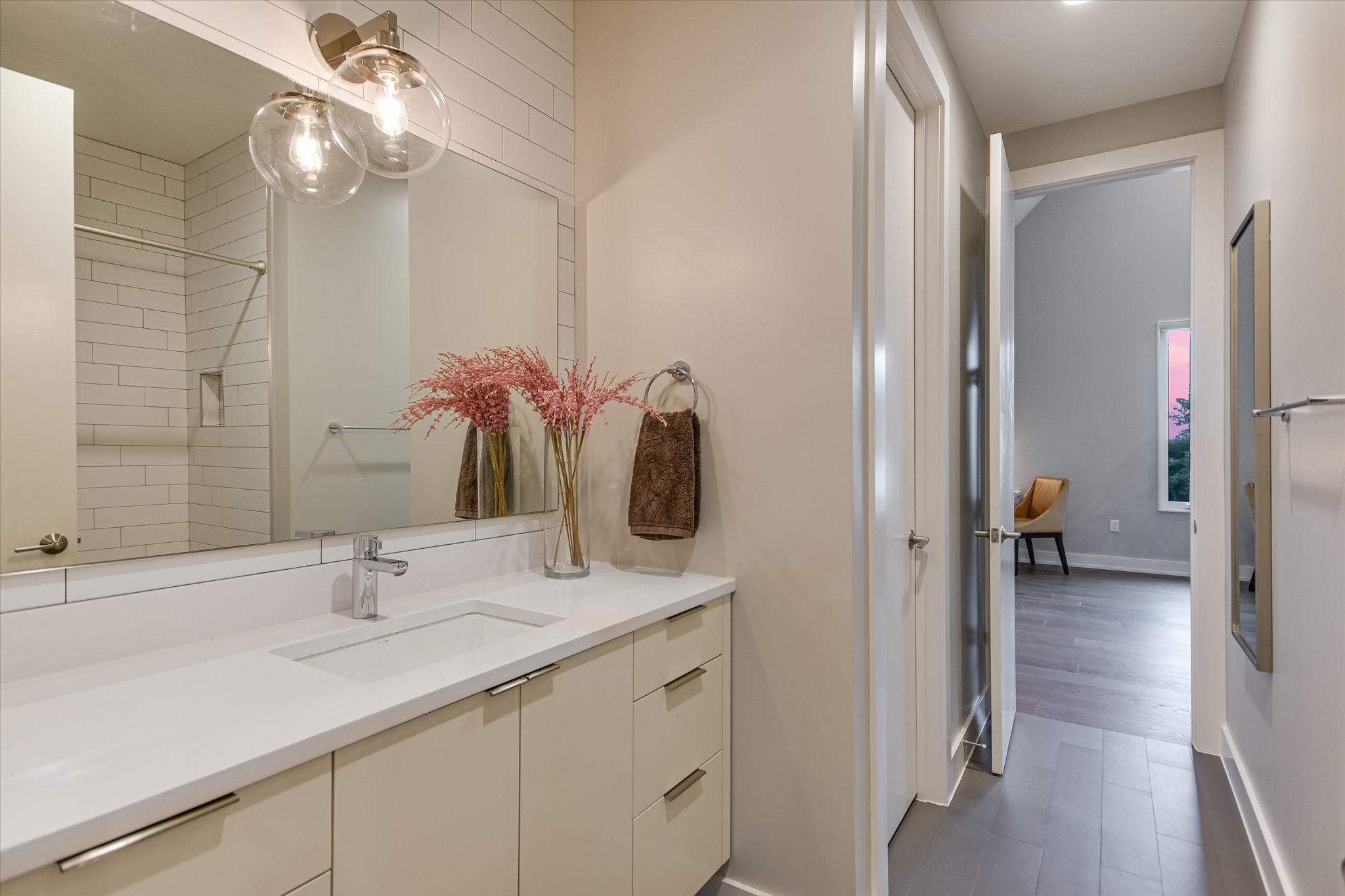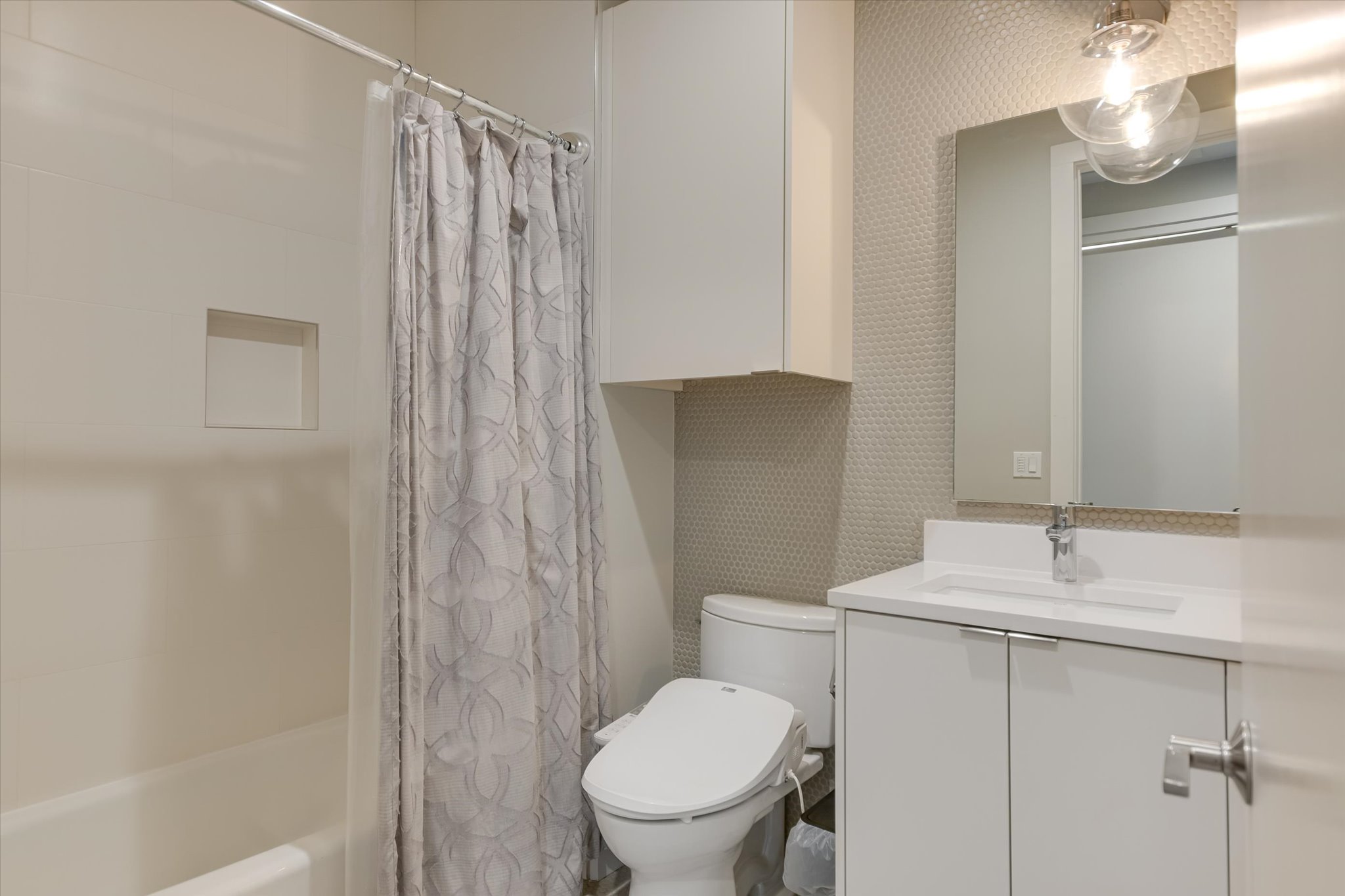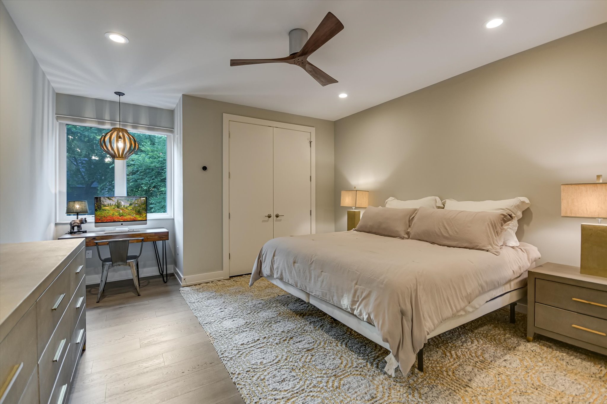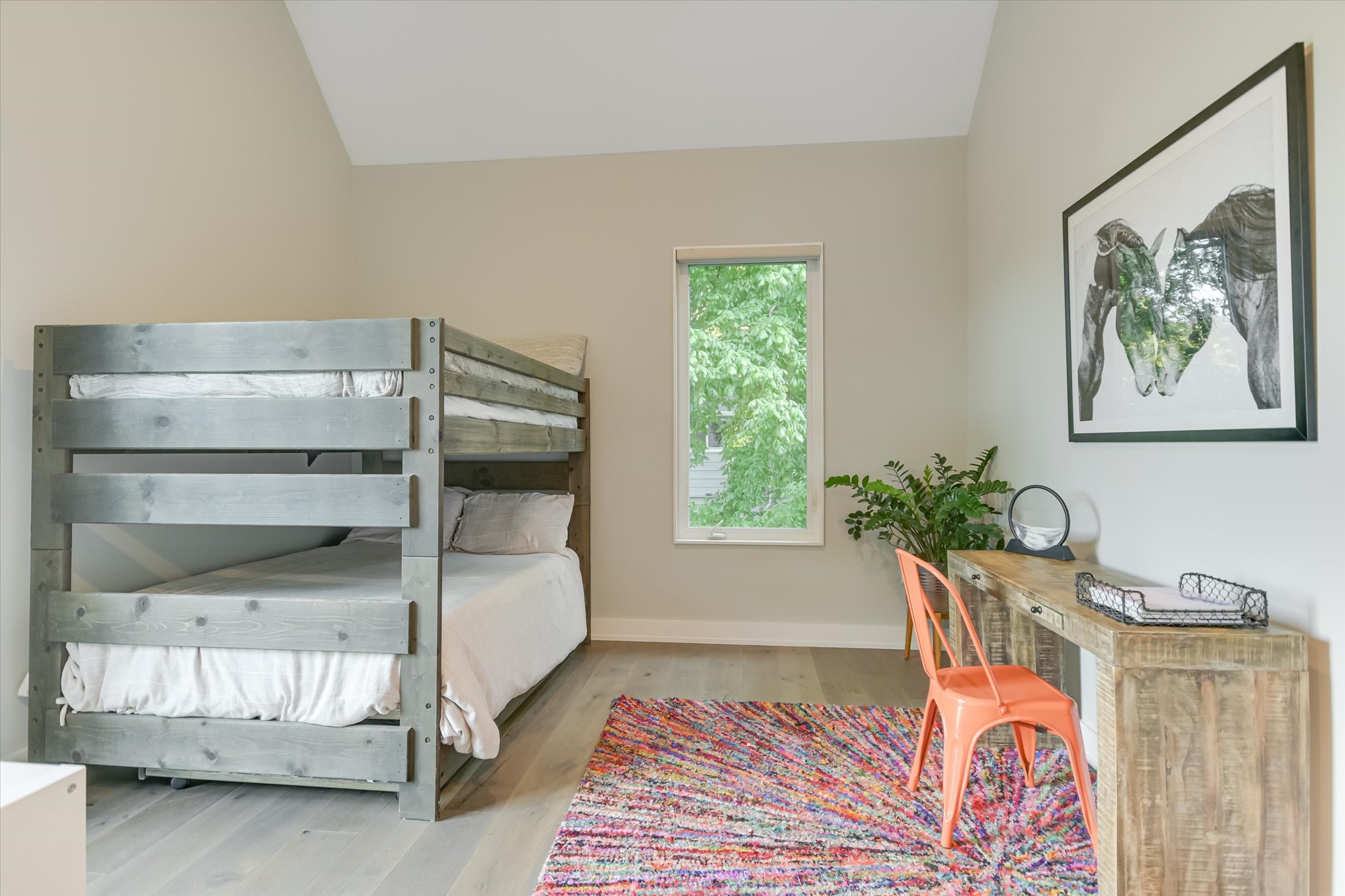 The flowing indoor/outdoor spaces will tempt you to entertain, and the open main floor lends itself to hosting. Gathering in the sleek modern kitchen outfitted with European cabinetry, Viking appliances and a large island, guests might chat with the cook before taking their cocktails outside to enjoy the landscape. When it’s time for quiet, the main-floor primary suite is a quiet sanctuary with direct access to the garden, four closets and a spa-like bath. At the top of the stairs, a study/bedroom enjoys 19-foot ceilings and huge plate-glass windows that let light stream in. A pass-through bath connects to a second bedroom with 15-foot ceilings. A third en-suite bedroom completes the upper floor.