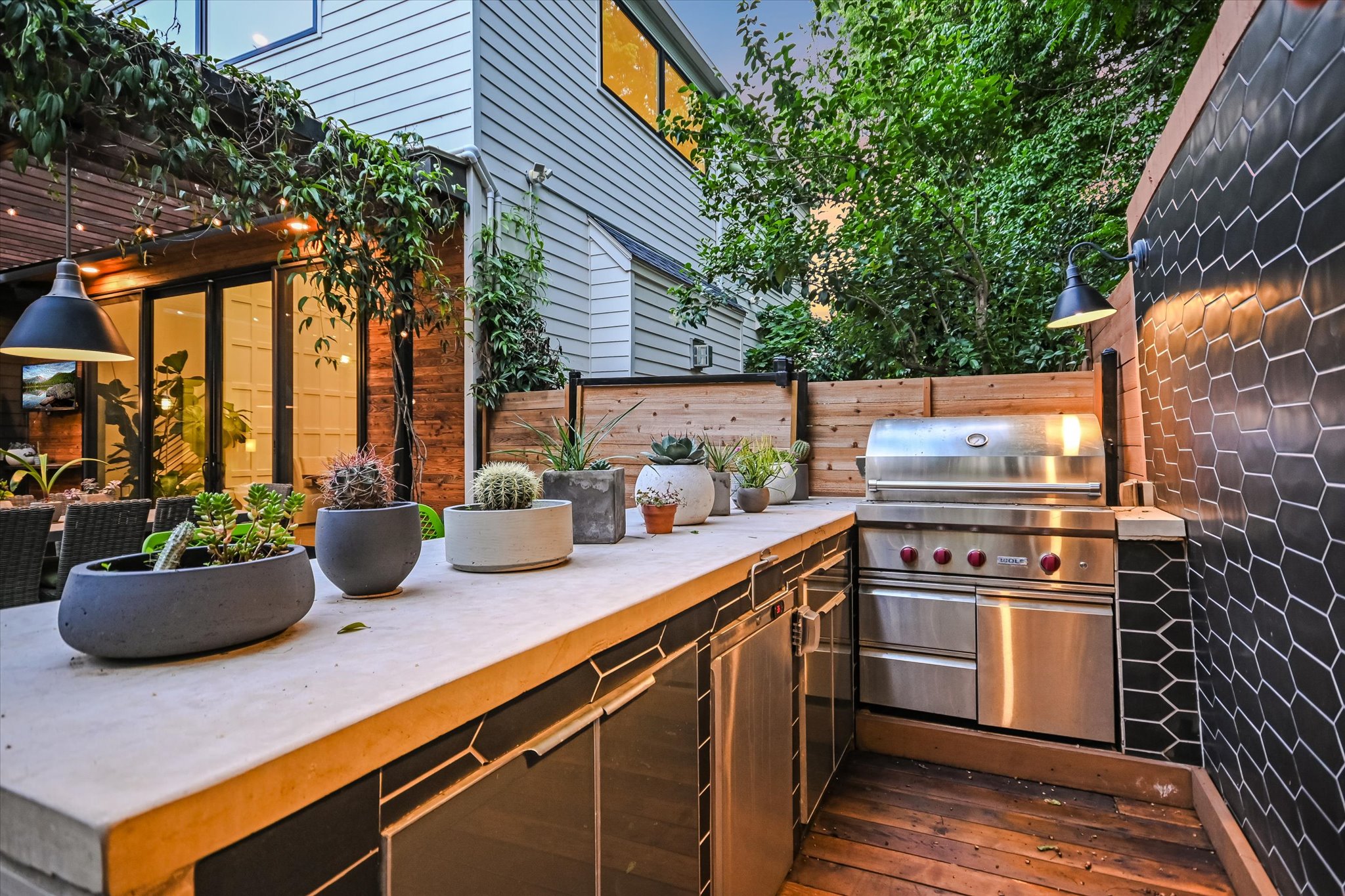 ● Outdoor kitchen with grill, refrigerator and seating bar